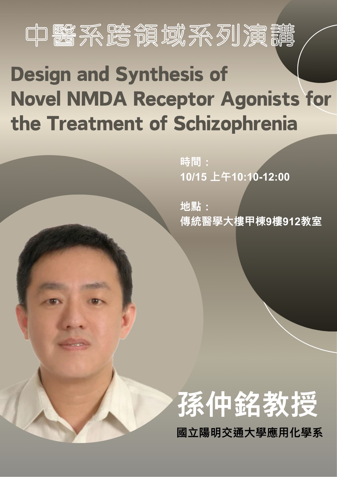 〔演講公告〕10月15日(三) 孫仲銘 教授(陽明交大應化系)-Design and Synthesis of Novel NMDA Receptor Agonists for the Treatment of Schizophrenia