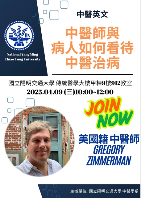 【演講公告】Gregory Zimmerman助理教授-中醫師與病人如何看待中醫治病