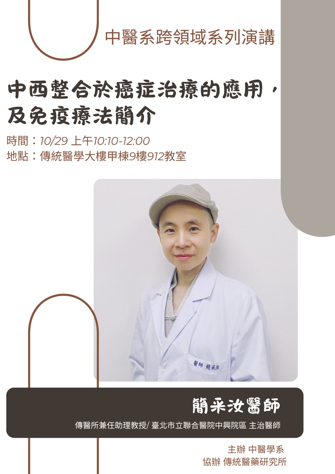 〔演講公告〕10月29日(三)簡采汝醫師(北市聯醫中興院區 主治醫師)-中西整合於癌症治療的應用,及免疫療法簡介