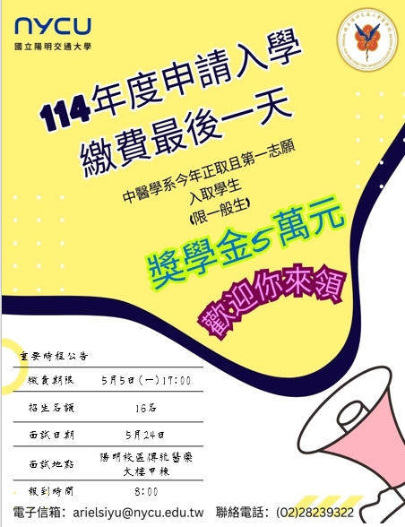 中醫學系114年度申請入學面試繳費最後一天喔~