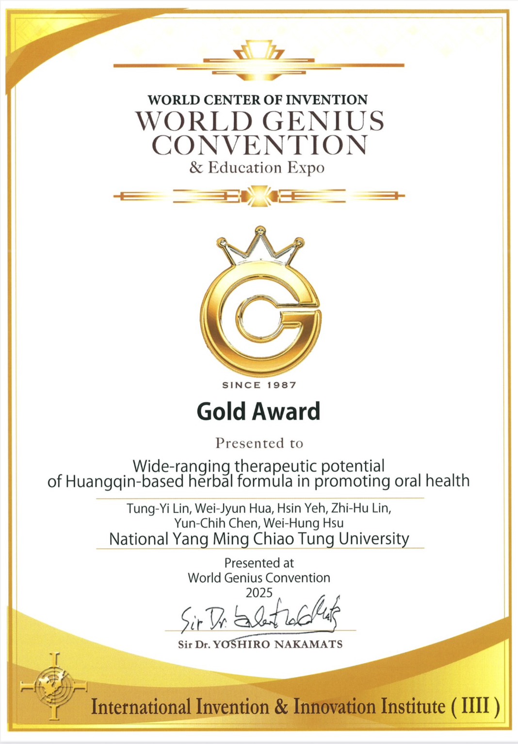 林東毅教授團隊與衛福部樂生療養院徐蔚泓醫師(中醫科主任)共同開發以黃芩為基礎之中藥複方(HF)作為治療口腔疾病的創新配方,榮獲「2025日本東京創新天才發明展」金牌獎肯定